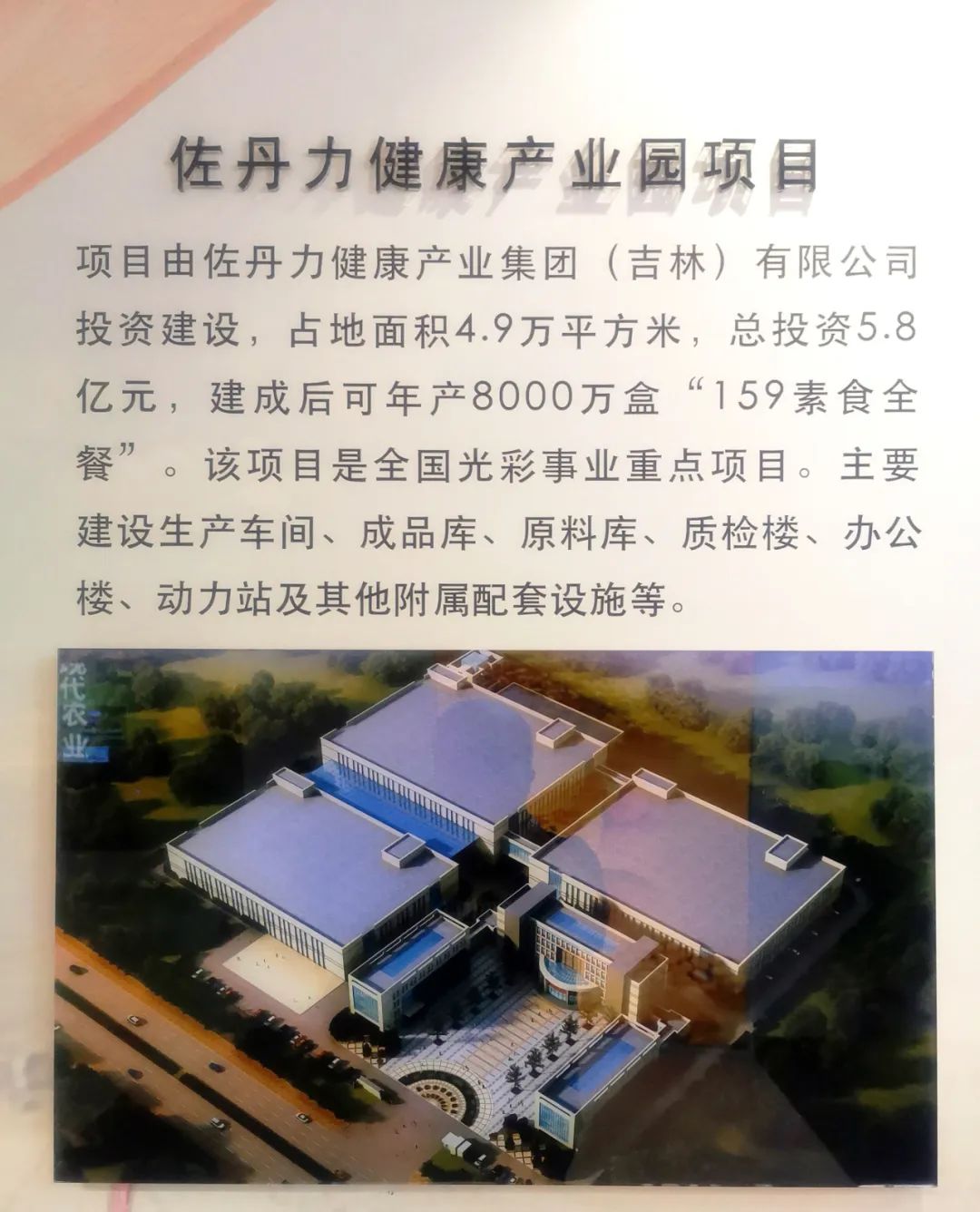佐丹力159健康产业园项目在长春新区规划展览馆作为长春新区农业产业化代表性 2020-07-24 上一篇 下一篇 ▲长春新区规划展览馆 佐丹力159健康产业园项目由佐丹力健康产业集团(吉林)有限公司投资建设,占地面积4.9万平方米,总投资5.8亿元,建成后可年产8000万盒“佐丹力159方便杂粮粥”。该项目是全国光彩事业重点项目。“佐丹力159方便杂粮粥”是中国南北极考察选用产品和中国航天事业合作伙伴产品。 ▲长春新区规划展览馆 佐丹力159健康产业园项目展示区 ▲长春新区规划展览馆 佐丹力159方便杂粮粥产品展示区
