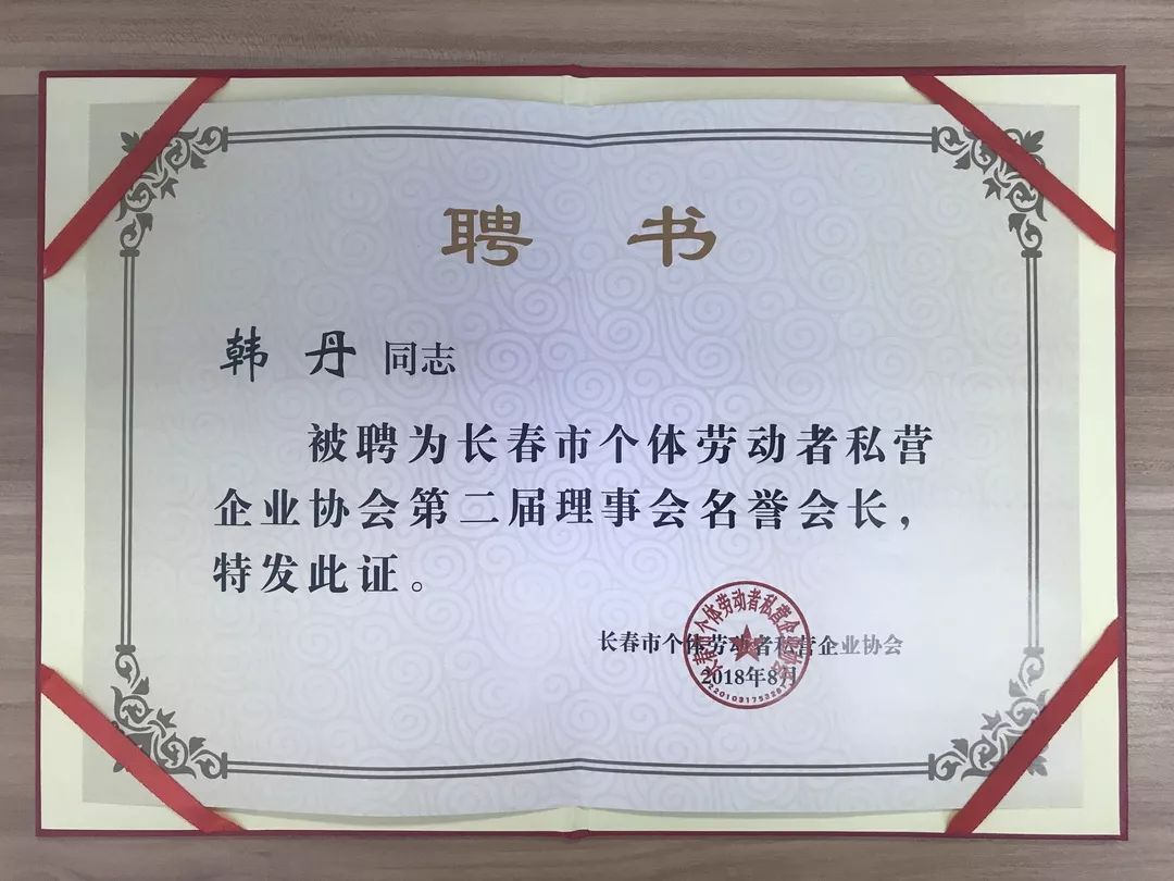 韩丹被聘为“长春市个体劳动者私营企业协会第二届理事会名誉会长”
