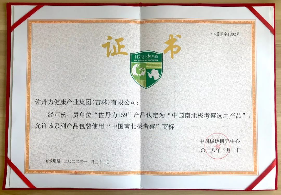 2018年5月9日,佐丹力集团与中国极地研究中心在上海举办合作签约发布会,“佐丹力159素食全餐”正式成为“中国南北极考察选用产品”,产品包装并取得使用“中国南北极考察”商标资格。