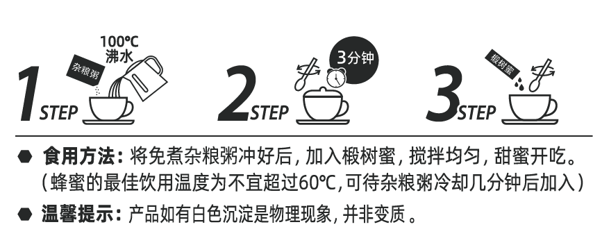 食用方法:将免煮杂粮粥冲好后,加入椴树蜜,搅拌均匀,甜蜜开吃。(蜂蜜的最佳饮用温度为不宜超过60℃,可待杂粮粥冷却几分钟后加入)。