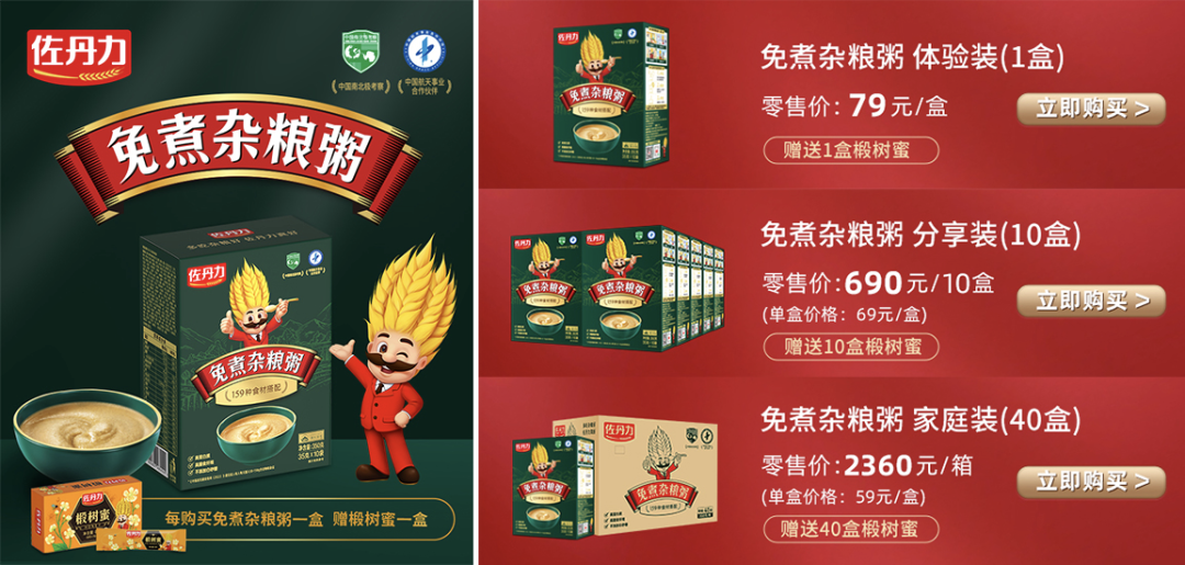 免煮杂粮粥及椴树蜜在【小程序官方商城】正式上线的同时,天猫、京东、拼多多等电商平台(天猫旗舰店、京东旗舰店、京东自营店、拼多多旗舰店)也将同步上架单盒装产品:佐丹力免煮杂粮粥零售价:79元/盒;佐丹力椴树蜜零售价:19.9元/盒;